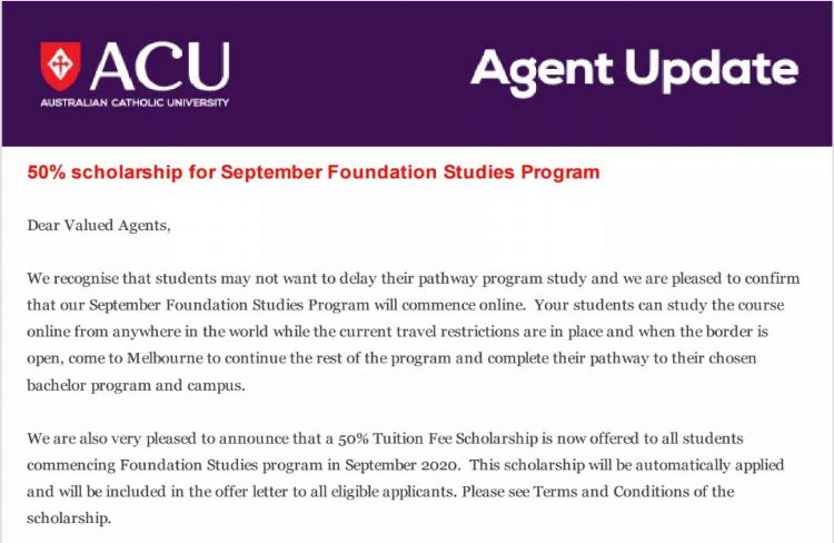 澳大利亚天主教大学决定为所有2020年9月入学的预科课程(Foundation)学生提供50%的学费奖学金。该奖学金将自动生成,并包含在所有满足要求的学生的录取通知书中。
