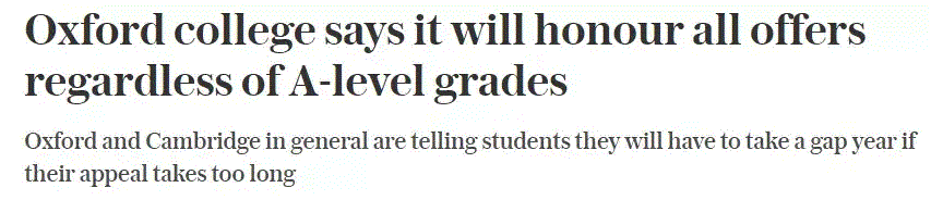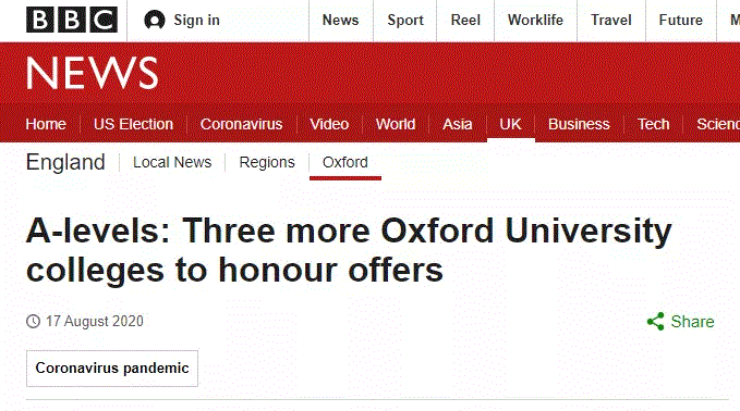 根据BBC的报道,有更多的牛津学院表示,无论A-level成绩如何,学院都将兑现其英国Offer持有者的入学名额(原文 “will honour all the places offered to UK students, irrespective of their A-level results”)。